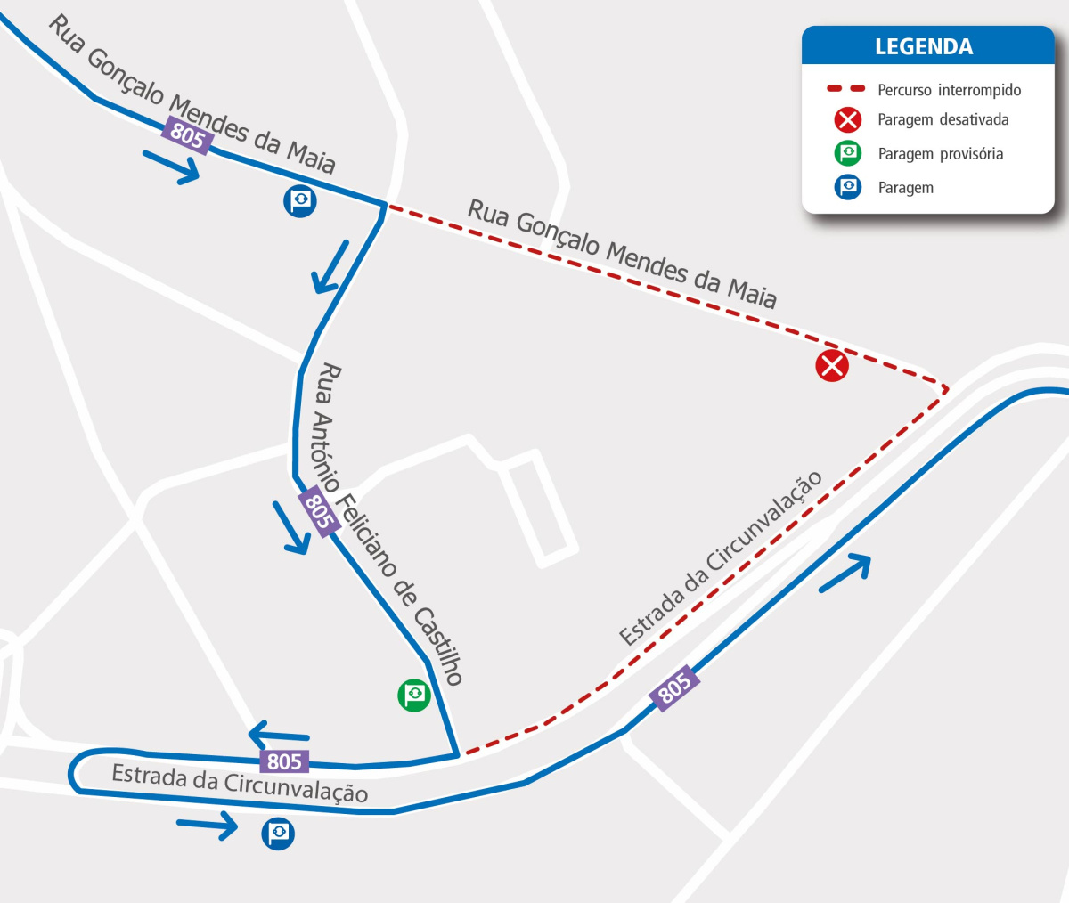 R. Gonçalo Mendes da Maia, R. António Feliciano de Castilho, Estrada da Circunvalação and normal route.