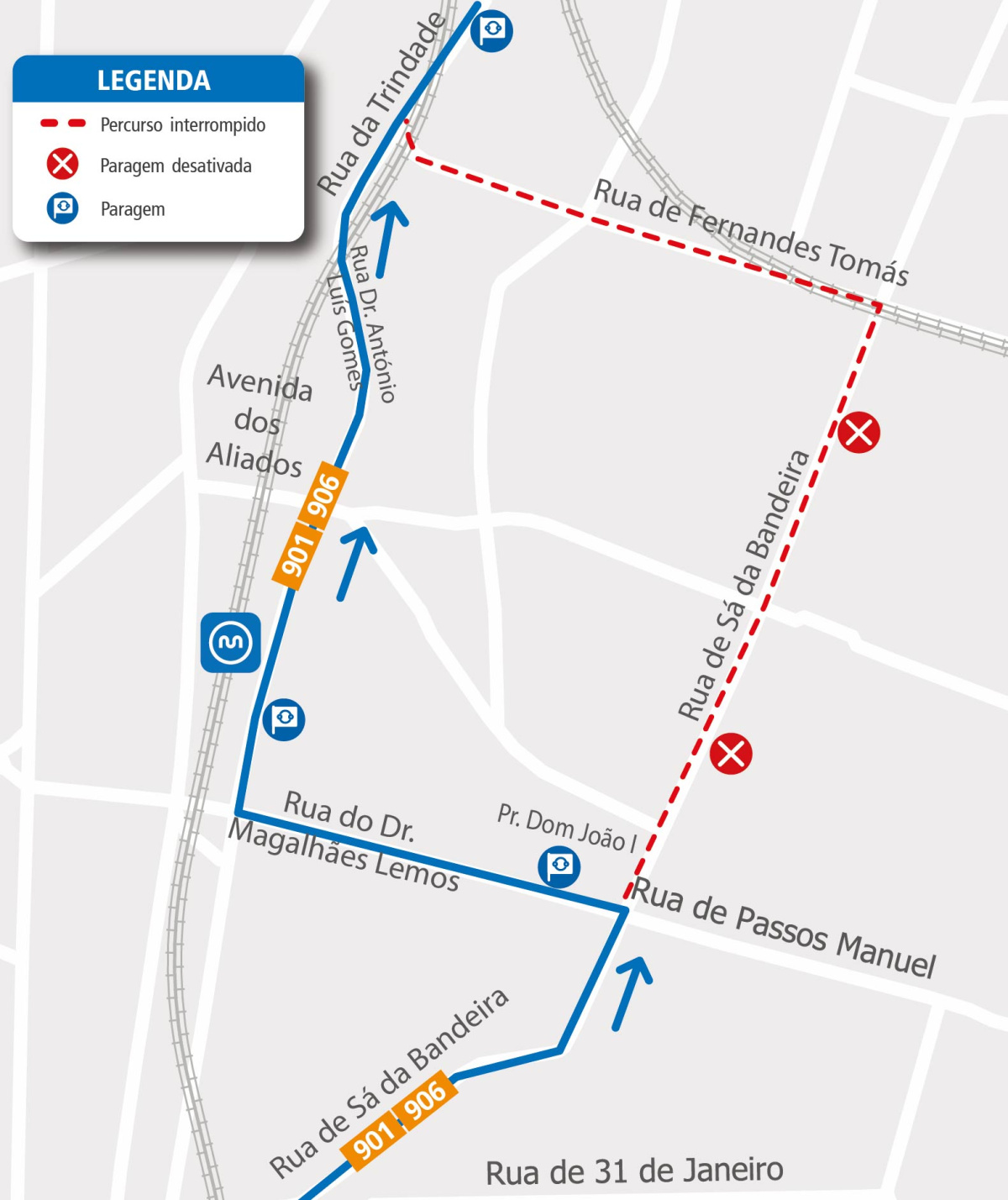 R. de Sá da Bandeira, Pr. Dom João I, R. do Dr. Magalhães Lemos, Av. dos Aliados, R. Dr. António Luís Gomes, R. da Trindade.