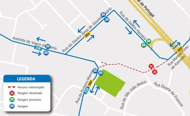 R. Manuel Pinto de Azevedo, R. Delfim Ferreira, R. Dr. Aires de Gouveia Osório, Av. Vasco da Gama, R. do Pinheiro Manso and normal route.
