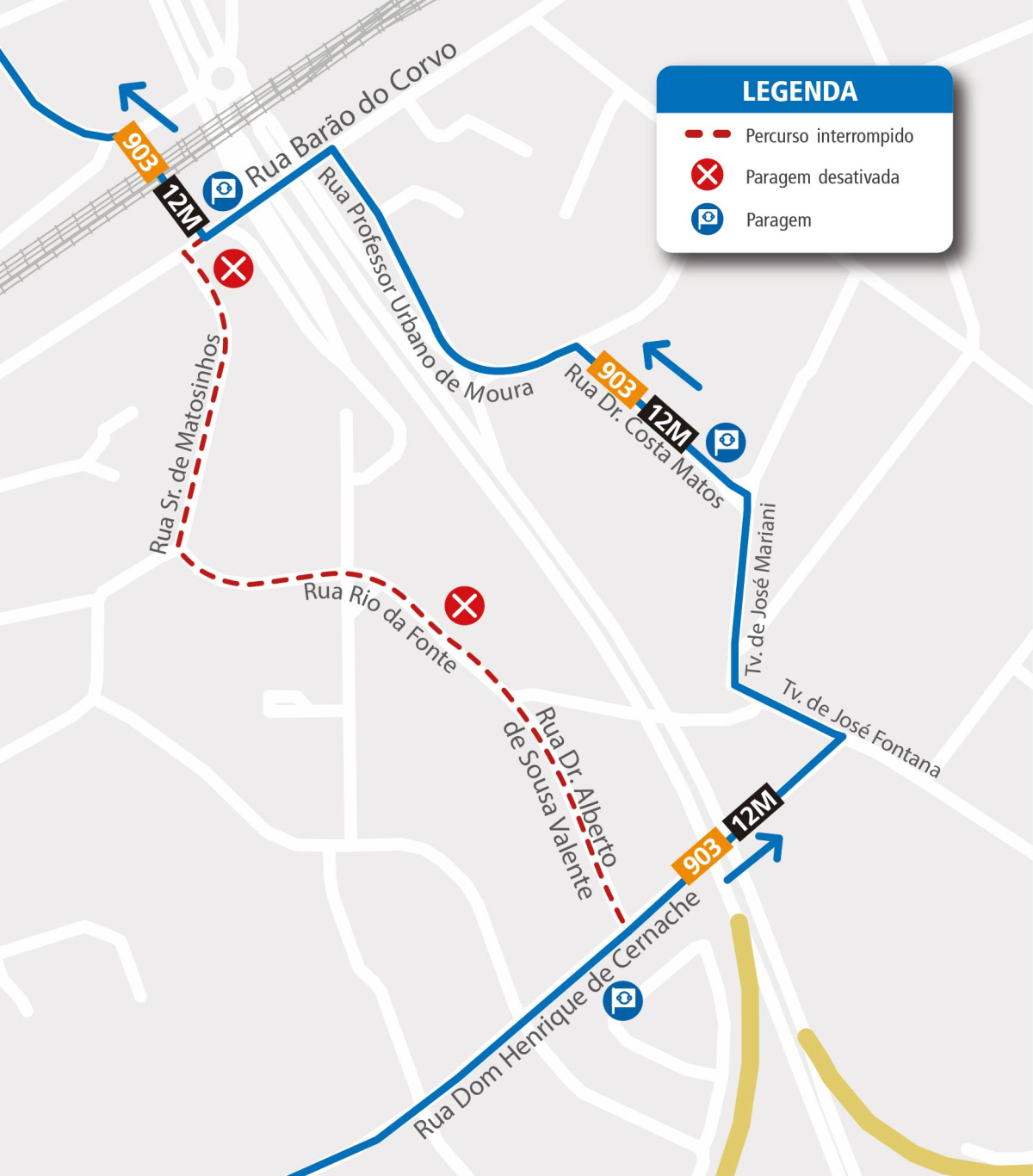 R. Dom Henrique de Cernache, Tv. José Fontana, Tv. José Mariani, R. Dr. Costa Matos, R. Professor Urbano de Moura, R. Barão do Corvo e percurso normal.